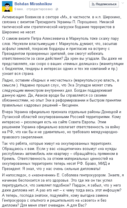 "Це означає, що ті порушення прав людини, які відбуваються на окупованих територіях, чиняться Російськими військами, російськими терористами, порушення прав людини", - сказав він.