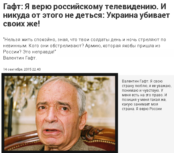 При этом артист говорил, что Россия не причастна к конфликту. "Кого они обстреливают? Армию, которая якобы пришла из России? Это неправда!", - заявлял Гафт.