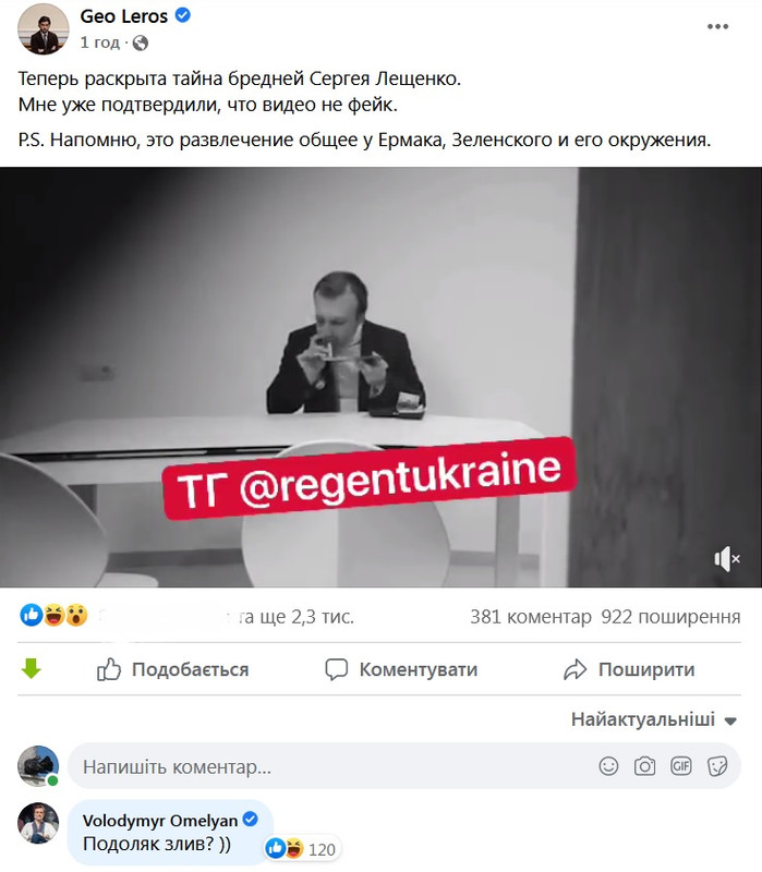 сегодня, 14:25 Автор: Денис Подставной Поделитесь публикацией: В Сети начали распространять ролик, на котором человек, похожий на бывшего члена наблюдательного совета "Укрзалізниці" Сергея Лещенко, нюхает неизвестное вещество. Экс-нардеп прокомментировал видео.  Сергей Лещенко. Фото: facebook.com/leshchenko.ukraine На кадрах опубликованного анонимными Telegram-каналами можно увидеть, как мужчина сидя за столом, сворачивает в трубку денежные купюры и употребляет порошкообразное вещество.  Видеороликом поделился у себя на официальной странице в социальной сети Facebook народный депутат Гео Лерос.  По словам политика, у него есть информация о том, что видео не является фейковым.