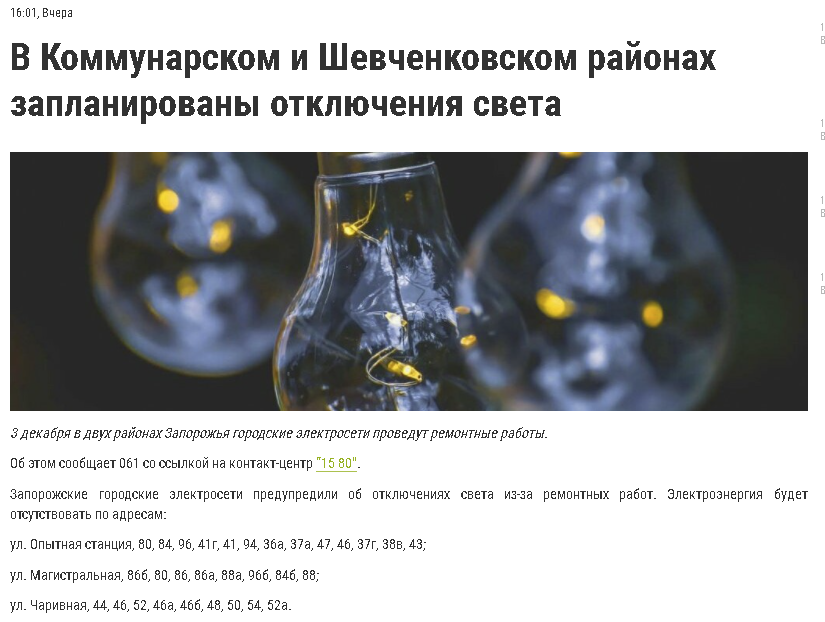 В Запорожье без света останутся 14 домов, - АДРЕСА