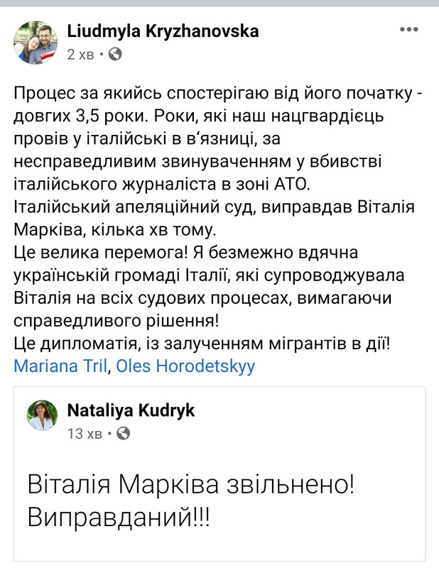 Суд в Італії поставив крапку у справі нацгвардійця Марківа Повний текст читайте тут: https://m.glavcom.ua/world/observe/sud-v-italiji-postaviv-krapku-u-spravi-nacgvardiycya-markiva-805508.html