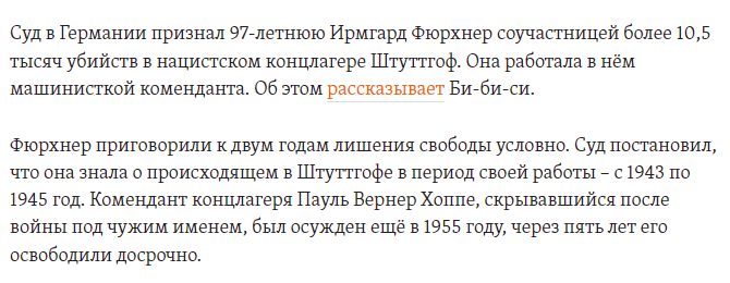 Когда в сентябре 2021 года начался суд, Фюрхнер сбежала из дома престарелых – позже её задержали в Гамбурге. "Я сожалею обо всём, что произошло. Я сожалею, что в то время находилась в Штуттгофе. Это всё, что я могу сказать", – сказала она перед приговором.
