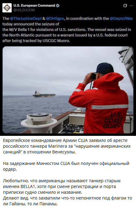 Южное командование Вооружённых сил США объявляет об аресте ещё одного судна российского теневого флота в водах Карибского моря: танкера Sophia