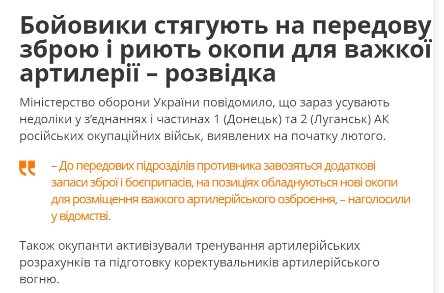При попытке атаки в районе Золотого Луганской области 18 февраля враг использовал тяжелую артиллерию 152 калибра. Украинская армия не могла ответить из аналогичного вооружения, поскольку оно отведено. Тем не менее, украинские силы дали достойный отпор врагу.