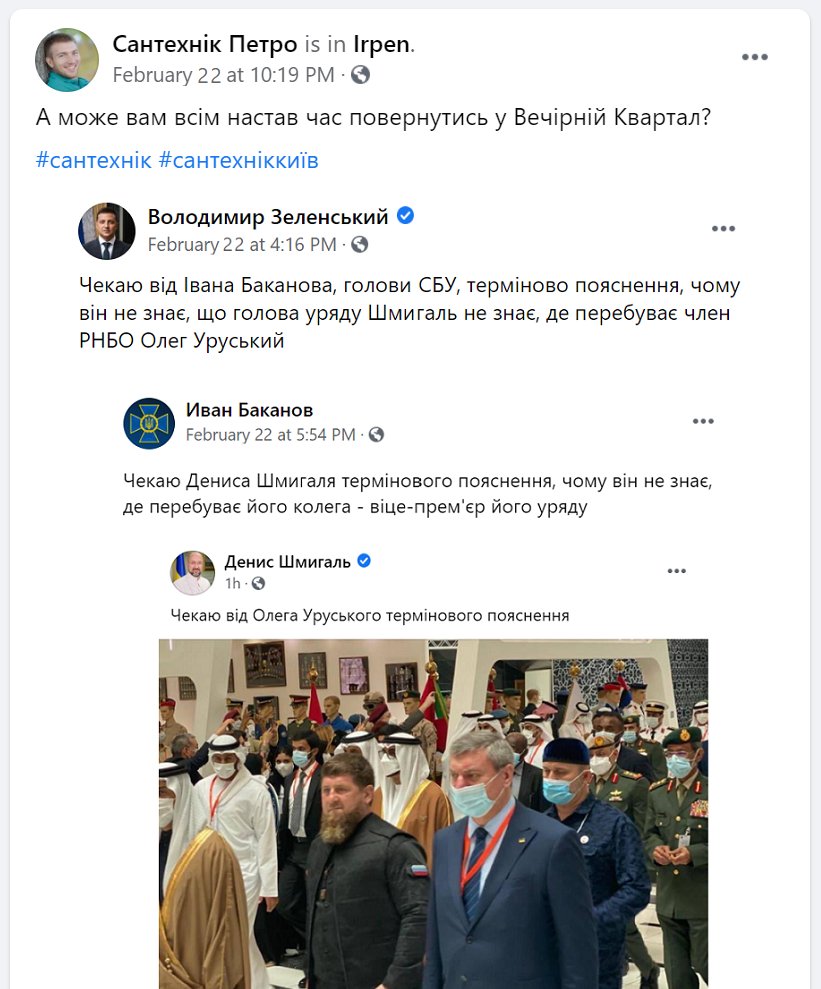 У соцмережах поширилися фото і відео з виставки зброї в ОАЕ, де віце-прем’єр Олег Уруський стоїть і сидить поруч із главою Чечні Рамзаном Кадировим. Через ці знімки глава Уряду Денис Шмигаль вже почав вимагати термінових пояснень.
