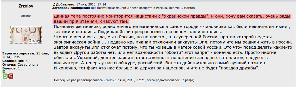 Заходил туда из любопытства несколько раз. Сложилось впечатление, что там пасется много "крымчан" из москв, пенз, новосибирсков и ебургов. При этом именно они часто держат местную вату в тонусе, надрачивая нужный градус поцреотизма.