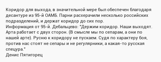 Вночі 18 лютого бійці отримали наказ про відступ з Дебальцева. Рухались в колонах по кілька десятків машин. Трофеїв, запевняють, бойовикам не залишили. З оточення виходили польовими дорогами. Сепаратисти обстрілювали колони з артилерії. Серед силовиків є втрати пораненими та вбитими.