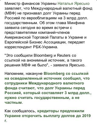 По словам Яресько, такая позиция кредиторов является неприемлемой для Украины и такой шаг был бы незаконным, что подтверждает и Международный валютный фонд