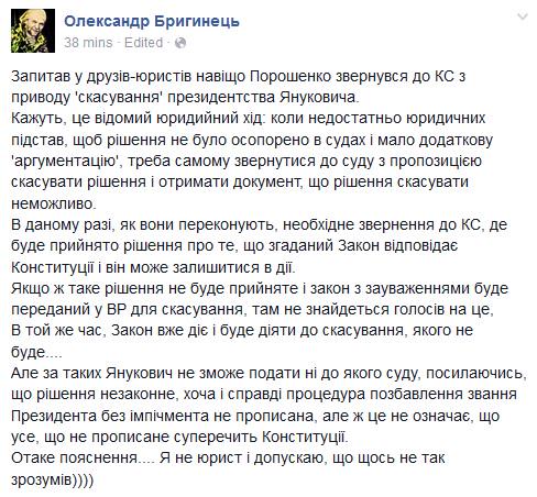 У поданні Порошенка щодо відповідності Конституції України закону "Про позбавлення В.Януковича звання президента України" вказано, що даний закон не має нормативного характеру.