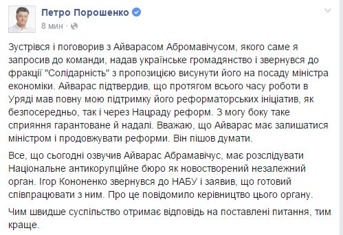 Як відомо, у середу глава Мінекономіки Абромавичус заявив, що іде відставку, у тому числі і через спроби соратника президента Ігоря Кононенка "встановити контроль над державними грошима".