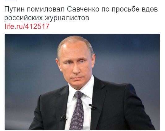 ,,Также стало известно, что Владимир Путин подписал указ о помиловании Надежды Савченко, с просьбой о помиловании к президенту обратились родственники погибших в Донбассе журналистов ВГТРК.''