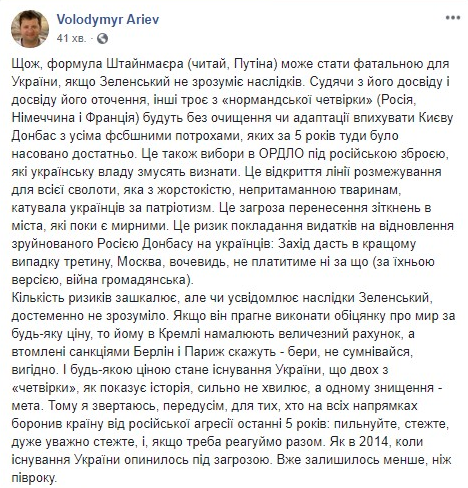 Щойно Зеленський офіційно підтвердив, що на зустрічі “нормандської четвірки” обговорюватиметься “формула Штайнмаєра”. Саме вона, вочевидь, стане головною формулою “миру” на сході. Нагадаю, що вона  передбачає: