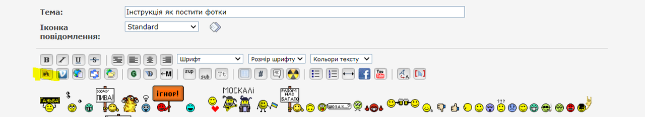 5. В режимі редагування повідомлення нажимаєш "шосту кнопку" і між двома доданими тегами вставляєш лінк картинки з кліпборду