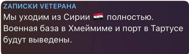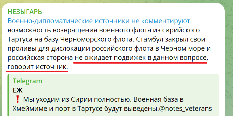 «В Сирии мы, к сожалению, проиграли борьбу с Эрдоганом. Источники в Кремле и Минобороны опасаются, что аппетиты Турции в отношении Крыма теперь вырастут, желание получить его под свой контроль усилится. И могут быть серьезные удары по полуострову… События в Сирии могут повлиять на ход СВО. Вот только пока никто не знает, как. И эта растерянность нам очень не нравится. Как и непонимание насчет того, как именно мы будем выводить войска из Сирии. А что-то делать нужно срочно!… Источник в Кремле отмечает: после падения Асада нам будет сложнее находить и сохранять союзников в мире. «Есть сигналы о том, что пошатнется вера в силу русского оружия. Конечно, нужно быть дураком, чтобы эту веру потерять, но такие дураки уже появляются. Мы сейчас ведем серьезную работу над тем, чтобы купировать угрозу. Думаю, все получится», – отметил наш собеседник»