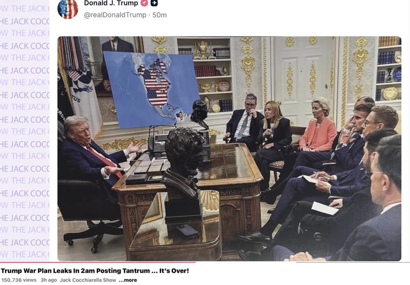 Truth Social опублікував два фотомонтажі: на одному він зображений разом із главами європейських держав та урядів і плакатом. Окрім США, під прапором США також зображені Венесуела, Гренландія та Канада.