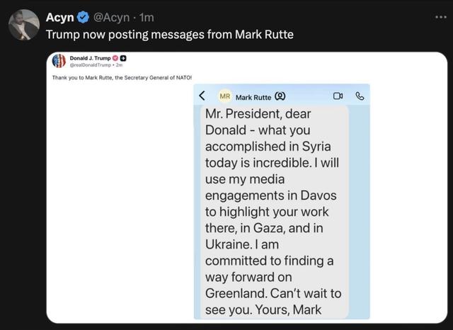Пане Президенте, шановний Дональде, те, чого Ви досягли сьогодні в Сирії, неймовірно. Я скористаюся своїми виступами в ЗМІ в Давосі, щоб висвітлити Вашу роботу там, у Газі та в Україні. Я відданий пошуку шляху вперед щодо Гренландії. Не можу дочекатися зустрічі з Вами. Ваш, Марк
