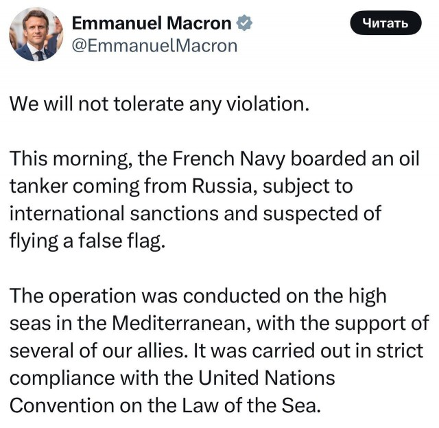 «Сьогодні вранці французькі ВМС піднялися на борт нафтового танкера, що прямував з Росії, який підпадає під міжнародні санкції та підозрюється у плаванні під чужим прапором. Операцію було проведено у відкритому морі в Середземному морі за підтримки кількох наших союзників», – заявив він.